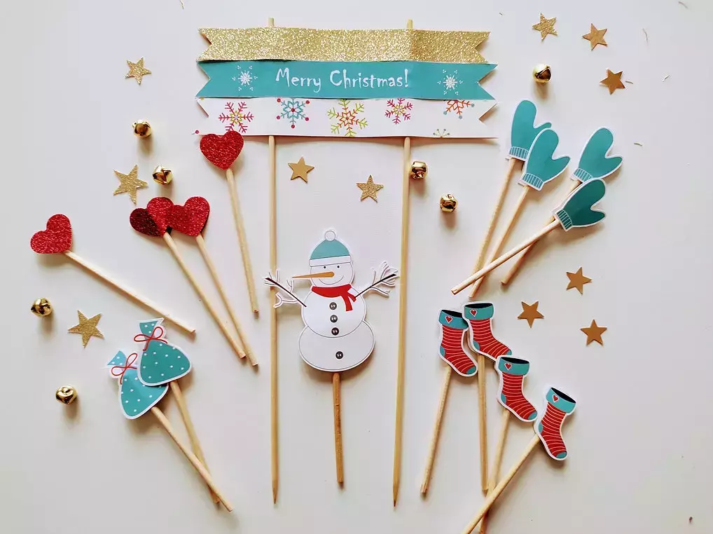 * 1 Topper grande com 2 palitos , frente e verso, com flâmulas coloridas e com glitter + 1 Topper de Boneco de Neve