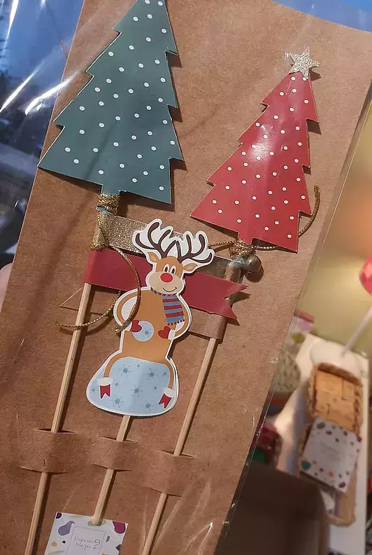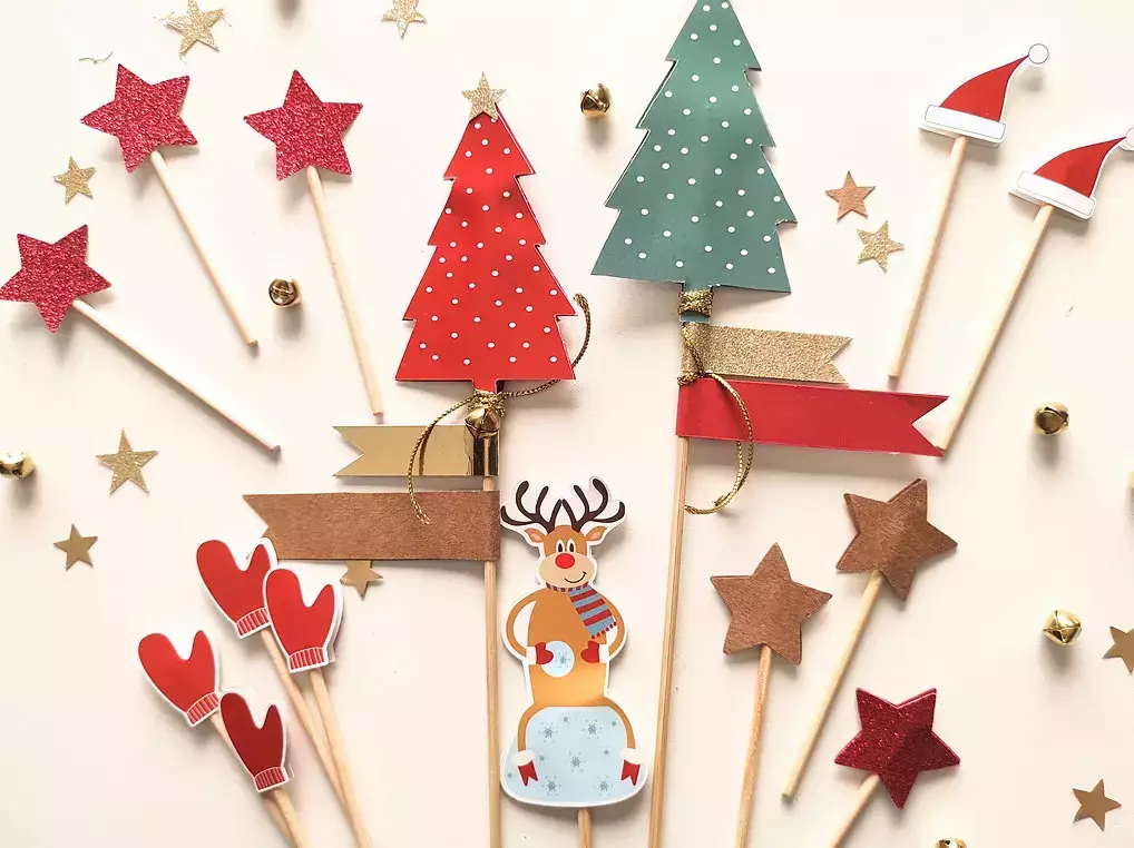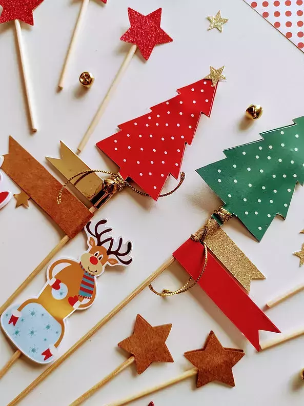 * 2 Toppers grandes de Árvores , frente e verso, com bandeirinhas e guizos + 1 Topper Rena Divertida, frente e verso.